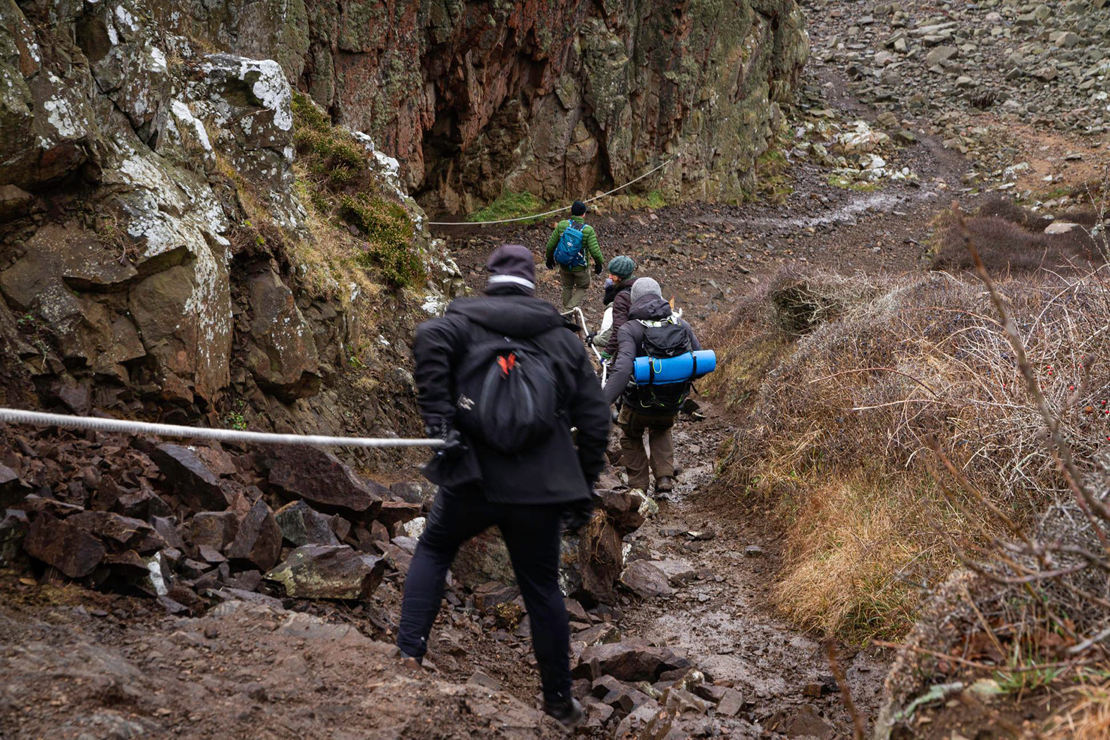 Det har mörknat och vi måste skynda oss tillbaka till tälten. Vi väljer den snabbaste vägen, den längs med rasbranten.